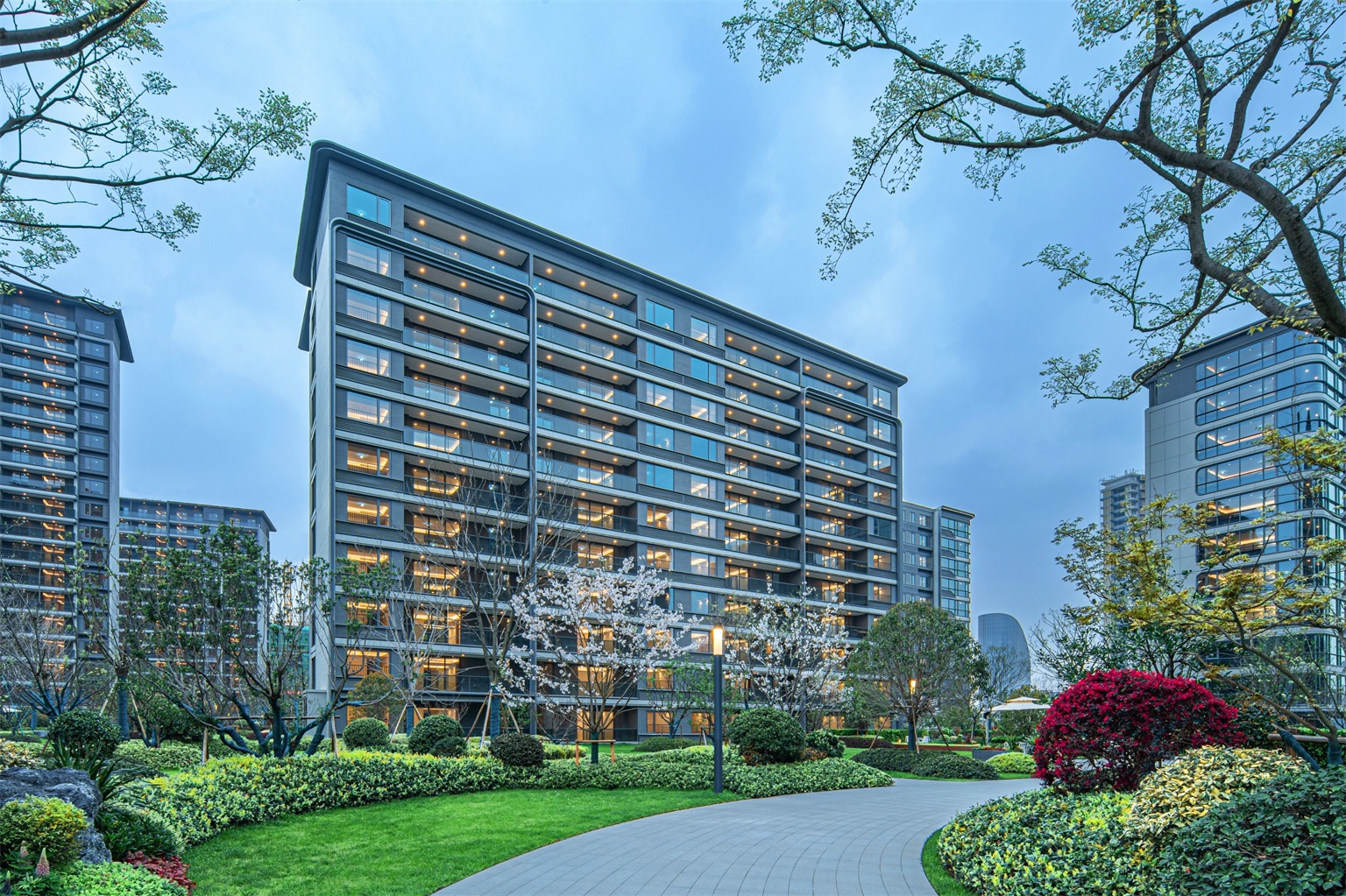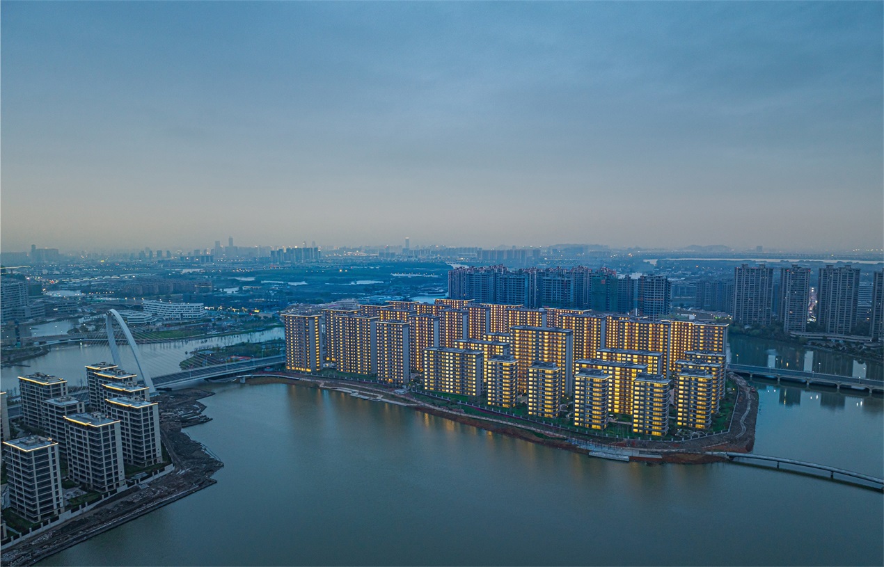 規(guī)劃設(shè)計(jì)既蘊(yùn)含了古典美學(xué)的中軸格局,又有現(xiàn)代都市的活躍與動(dòng)感。每幢樓宇間均能感受空間的層級(jí)劃分,由路向湖遞減的體量變化,體現(xiàn)了城市向自然與藝術(shù)的過渡轉(zhuǎn)變。